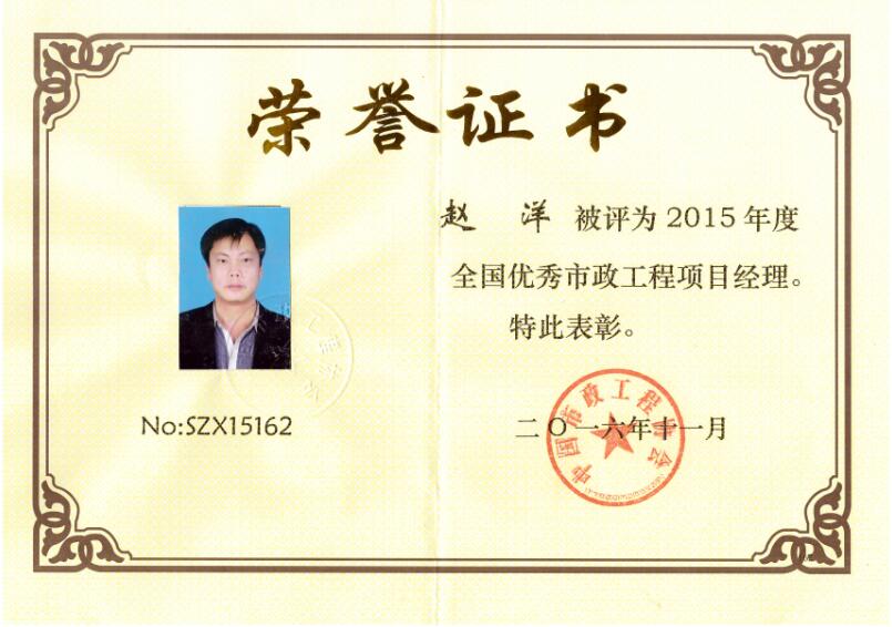 昨日,安徽省市政工程协会九届三次理事会议在庐江召开,我公司赵洋同志荣获“2015年度全国优秀市政工程项目经理”称号,全省仅有十二位同志获得此项殊荣。会上,省协会主要领导对获奖者颁发了荣誉证书....