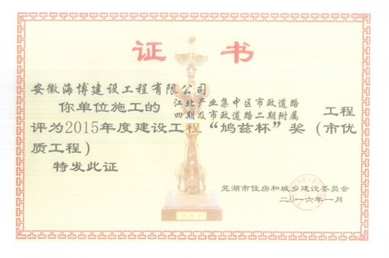 2016年2月2日,芜湖市建筑业协会于市住建委大楼召开建筑业协会常务理事会暨工作交流会;会上,芜湖市建委向荣获2015年“鸠兹杯”奖的单位颁发了获奖证书及奖杯,我单位承建的“江北产业集中区市政道路四...