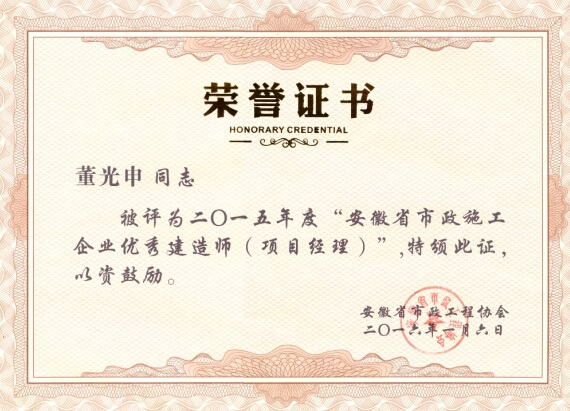 近日,从安徽省市政工程协会获悉,我公司董光申、赵洋、徐结南三位同志被评选为2015年度“安徽省市政施工企业优秀项目经理”,此次全省共评选出66位市政优秀项目经理,恭喜上述三位同志获得此殊荣...