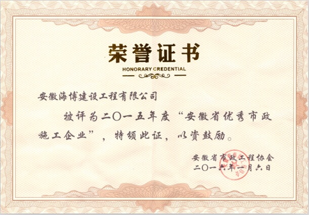 2015年度“安徽省优秀市政施工企业”评选结果于近日揭晓,此次全省共评选出40家优秀市政施工企业,热烈祝贺安徽海博建设工程有限公司位列其中。 目前,安徽海博建设工程有限公司与...