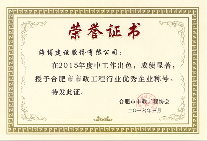 合肥市市政工程协会第三届三次理事大会于昨日召开,会上对2015年度评选出的合肥市市政工程“优秀企业”和“优秀项目经理”进行表彰,海博建设股份有限公司榜上有名,并且我司李申锋、郭剑两位同志也荣获...