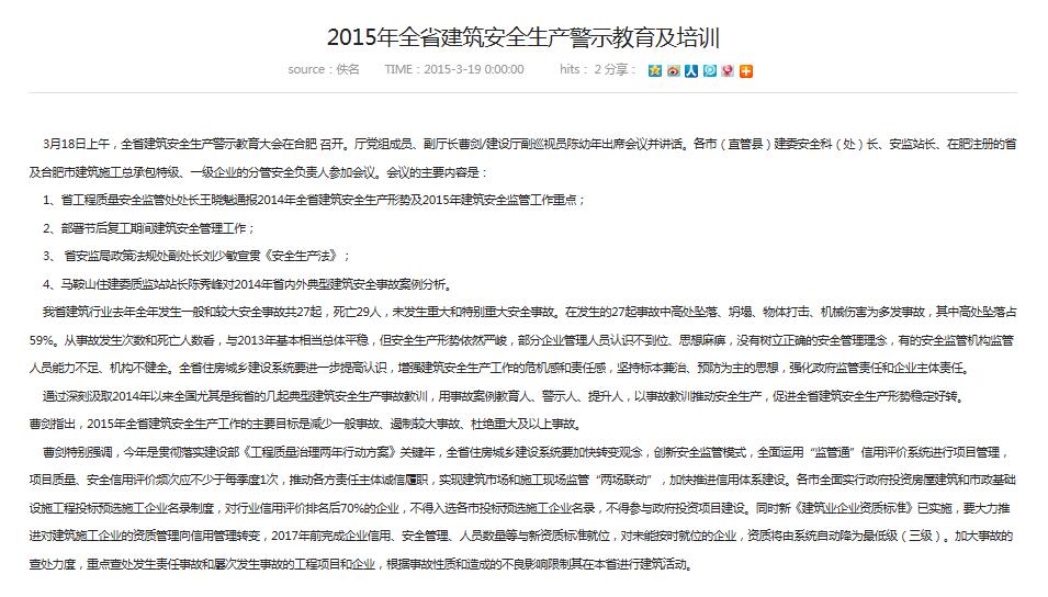 3月18日上午,全省建筑安全生产警示教育大会在合肥 召开。厅党组成员、副厅长曹剑/建设厅副巡视员陈幼年出席会议并讲话。各市(直管县)建委安全科(处)长、安监站长、在肥注册的省及合肥市建筑施工总承包...