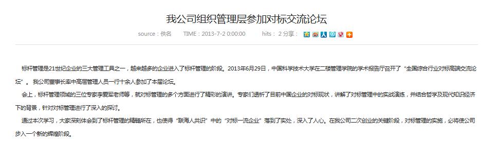 标杆管理是21世纪企业的三大管理工具之一,越来越多的企业进入了标杆管理的阶段。2013年6月29日,中国科学技术大学在二楼管理学院的学术报告厅召开了“全国综合行业对标高端交流论坛”。 我公司董事长....