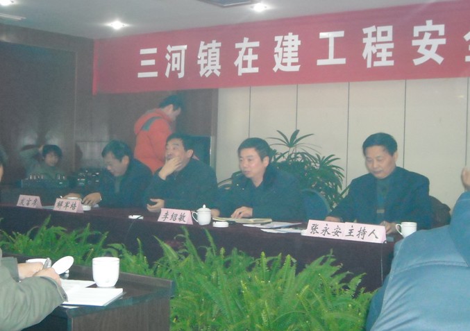 三河镇在建工程安全生产现场会于2009年12月19日09时在三河国际大酒店隆重召开,肥西县建设局党组书记张永安同志参加并主持会议,参加会议的领导还有肥西县建设局局长李绍敏,副局长解军培,副局长戴忠德等。