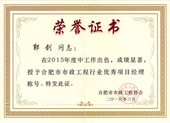 合肥市市政工程协会第三届三次理事大会于昨日召开,会上对2015年度评选出的合肥市市政工程“优秀企业”和“优秀项目经理”进行表彰,海博建设股份有限公司榜上有名,并且我司李申锋、郭剑两位同志也荣获“优秀项目经理”称号。