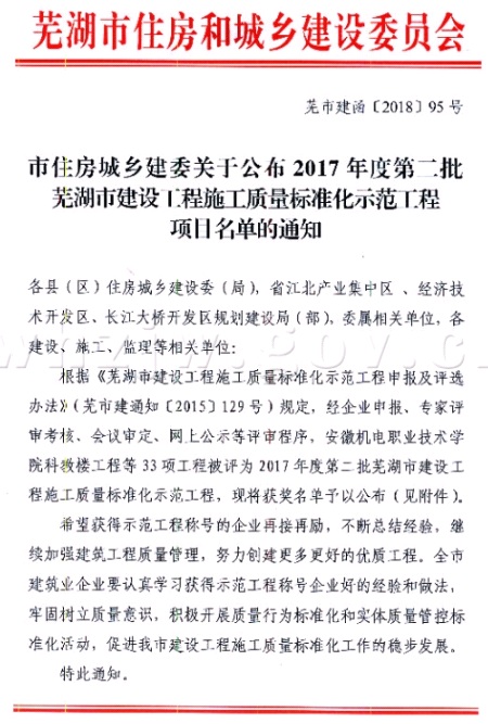 2017月12月15日,由芜湖市、无为县建设工程质量监督站及相应专家组成的评审组,按照《芜湖市建设工程施工质量标准化示范工程申报及评选办法》(芜市建通知[2015]129号),对该工程申报芜湖市建设工程施工质量标准化示范工程进行现场复审。