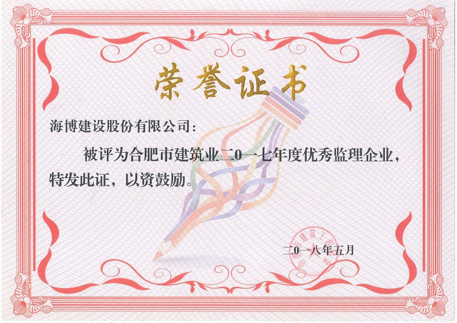 由朱海生秘书长宣读了合建协【2017】15号《关于表彰全市建筑业2017年度优秀企业、单项先进企业、先进个人的决定》,我公司在此次优秀企业评选中再次获得优秀施工总承包企业、优秀监理企业称号,连续两年获得此项荣誉,这将更加增强我们海博人勇于争先、砥砺奋进、坚定前行之斗志和信心。然后由潘孝艳副会长对“合肥市建筑工程优质结构奖”及“合肥市建筑施工安全生产标准化示范工地”评选办法进行了修订,明确了企业项目荣誉申报的方向及具体要求。