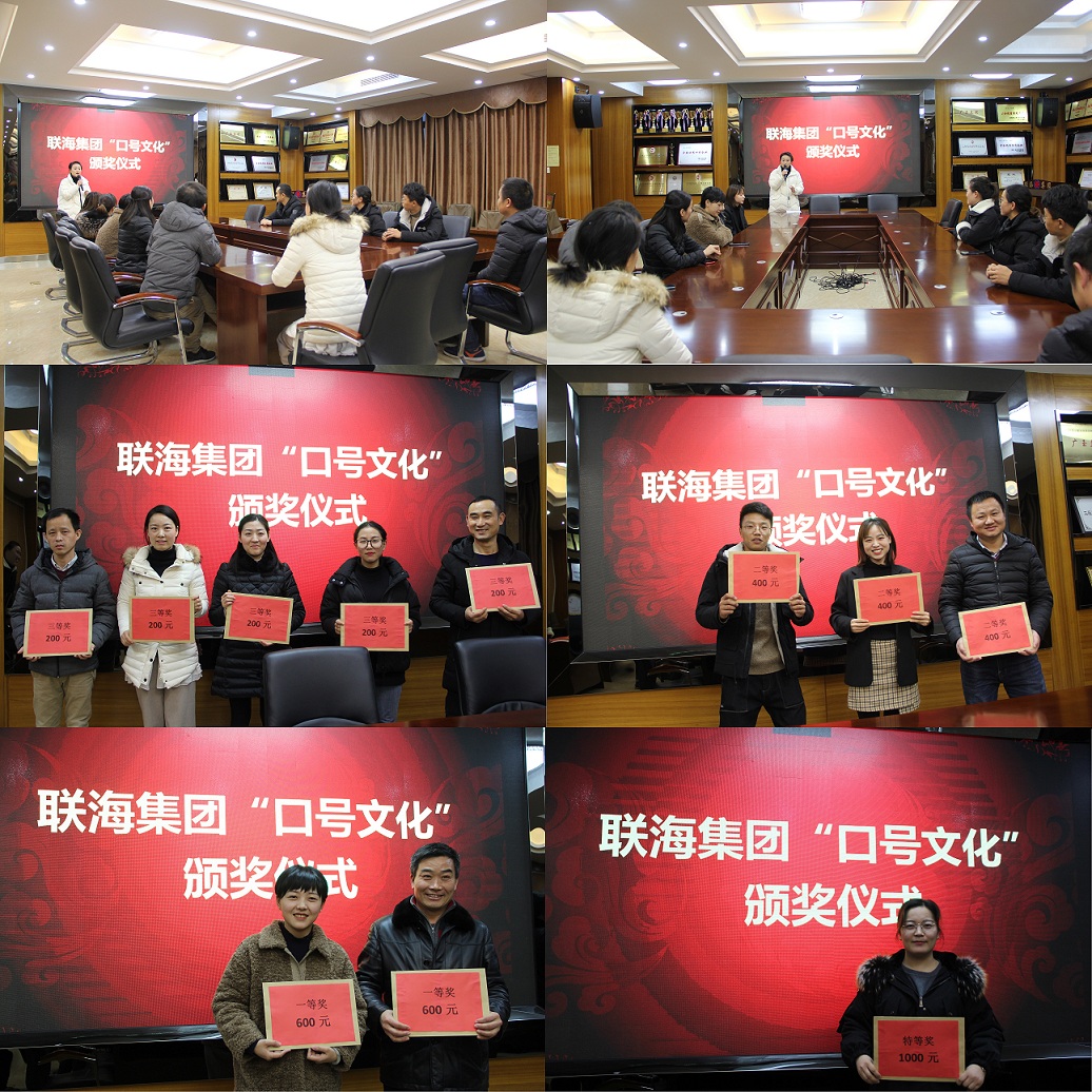 近期,集团公司开展了《关于联海集团“口号文化”征集大赛的通知》活动,经过两次征选、全员投票的方式,评比出特等奖、一等奖、二等奖、三等奖共计11条获奖口号。并于2019年12月25日下午17:00由发展战略执行中心组织了颁奖仪式,对获奖口号的部门给予表彰和现金奖励。