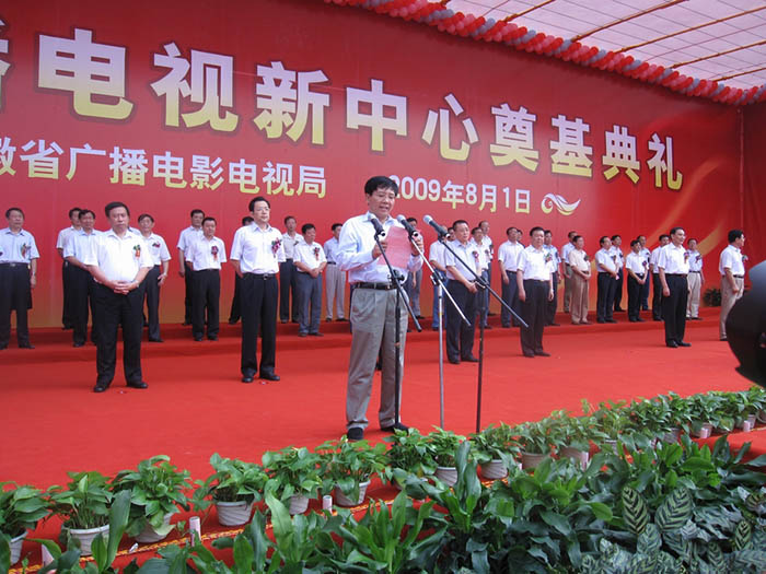 仪式上省广电局张苏洲局长和孙金龙书记先后在典礼上致辞,王金山同志宣布奠基开工仪式正式启动,省市主要领导同志为奠基碑培土奠基,两边的礼花在掌声中同时绽放,施工机械也同时鸣笛,为省广播电视新中心项目正式开工拉开了序幕。